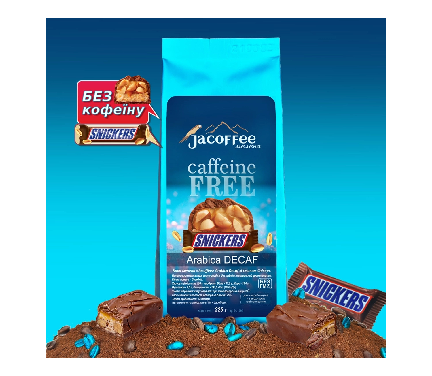 Кава мелена Jacoffee Arabica без кофеїну зі смаком Снікерс, 225 г