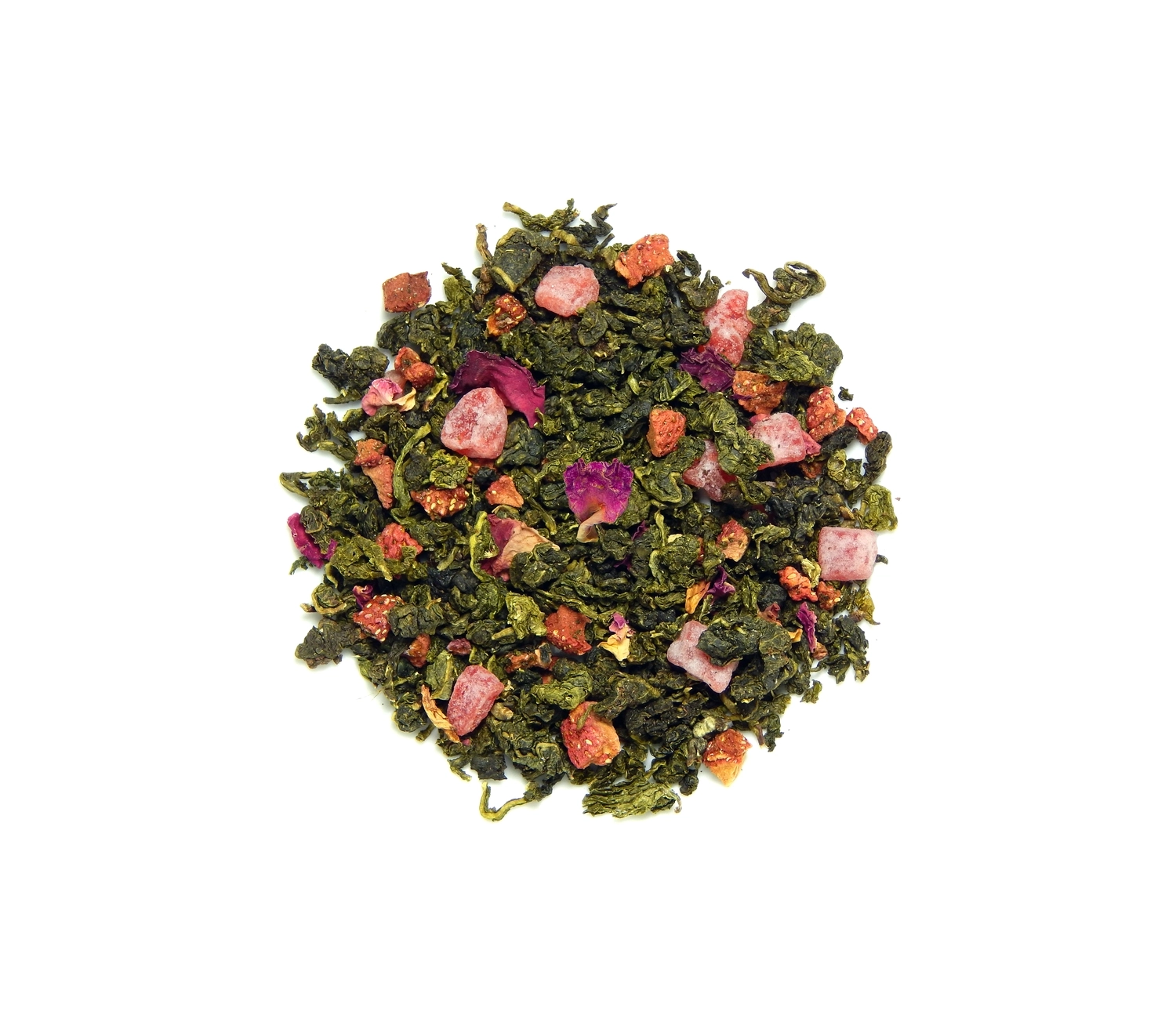 Чай зеленый ароматизированный Оолонг с клубникой и малиной, 1кг В состав входят: Зеленый полуферментированный чай Оолонг, ягоды клубники, ягоды малины, лепестки чайной розы, натуральный ароматизатор.