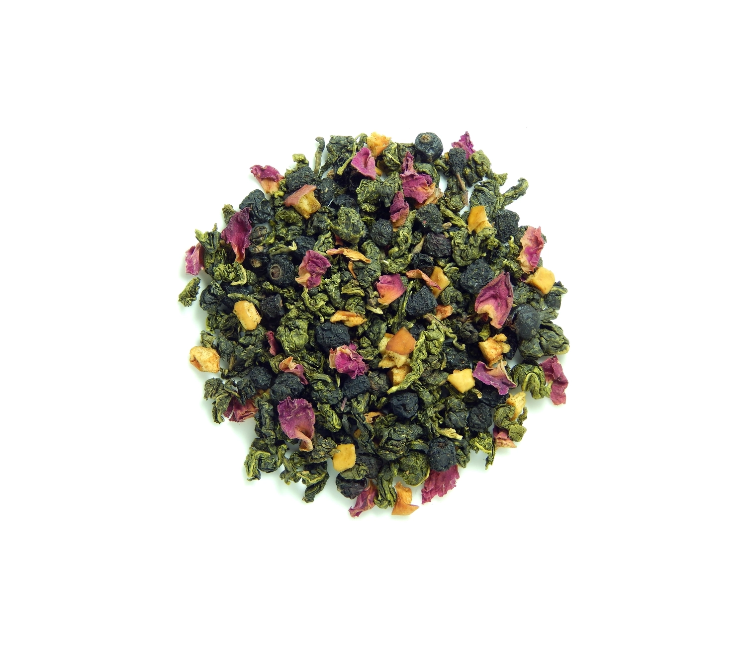 Чай зеленый ароматизированный Оолонг с голубикой, 1кг В состав входят: высококачественный китайский зеленый чай Оолонг, ягоды голубики, лепестки цветов, натуральный ароматизатор.