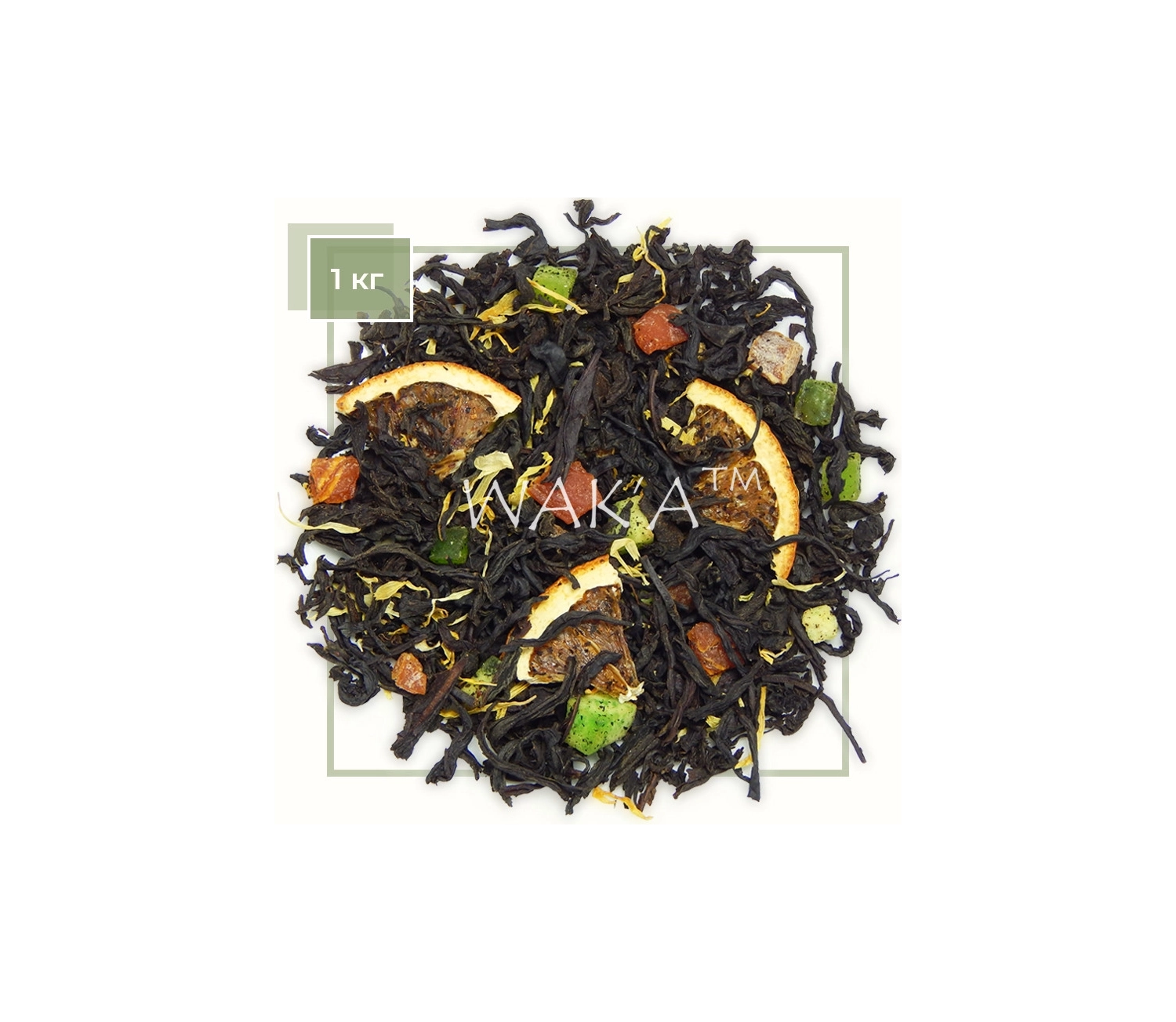 Чай черный Апельсин киви 1 кг Состав: чай черный цейлонский крупнолистовой, сушеный апельсин, сушеный киви, цукаты апельсина, цукаты киви, лепестки календулы, натуральный ароматизатор