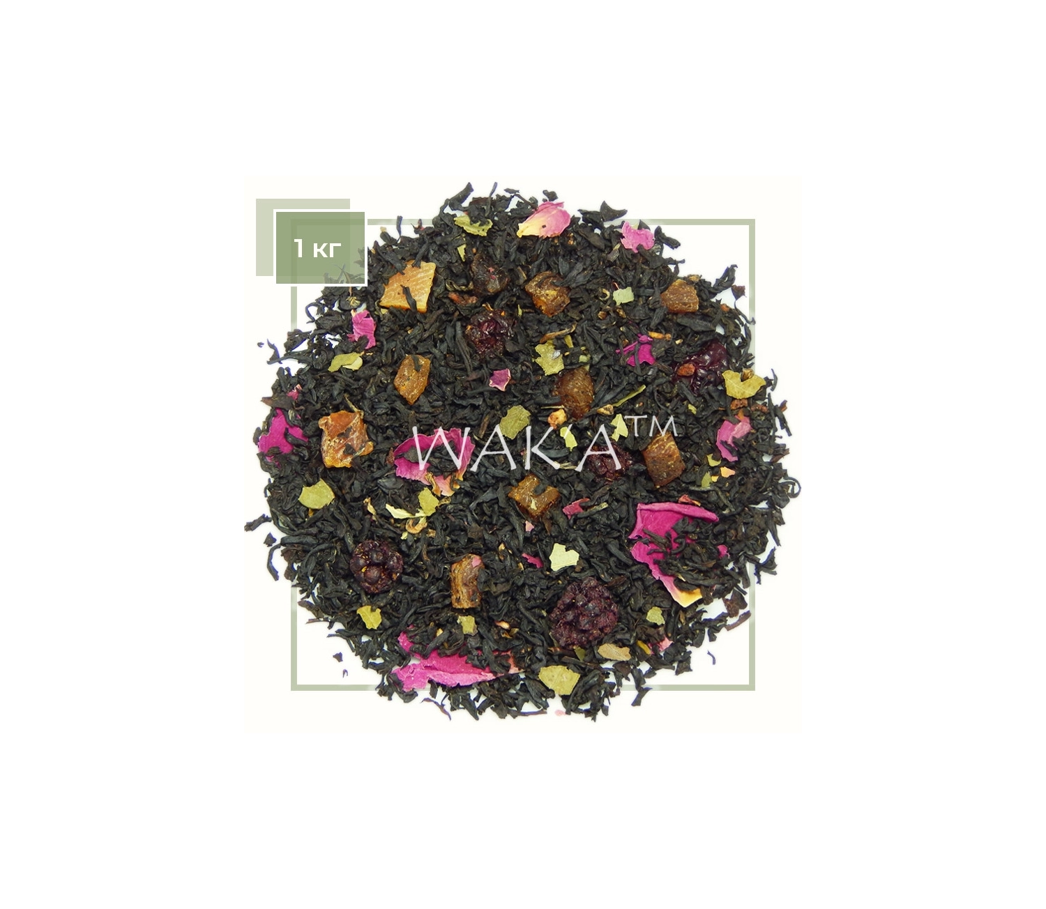 Чай черный Феерия вкуса Состав: ароматизированный чай, манго, листья земляники, цукаты, лепестки розы, сублимированная малина и ежевика.