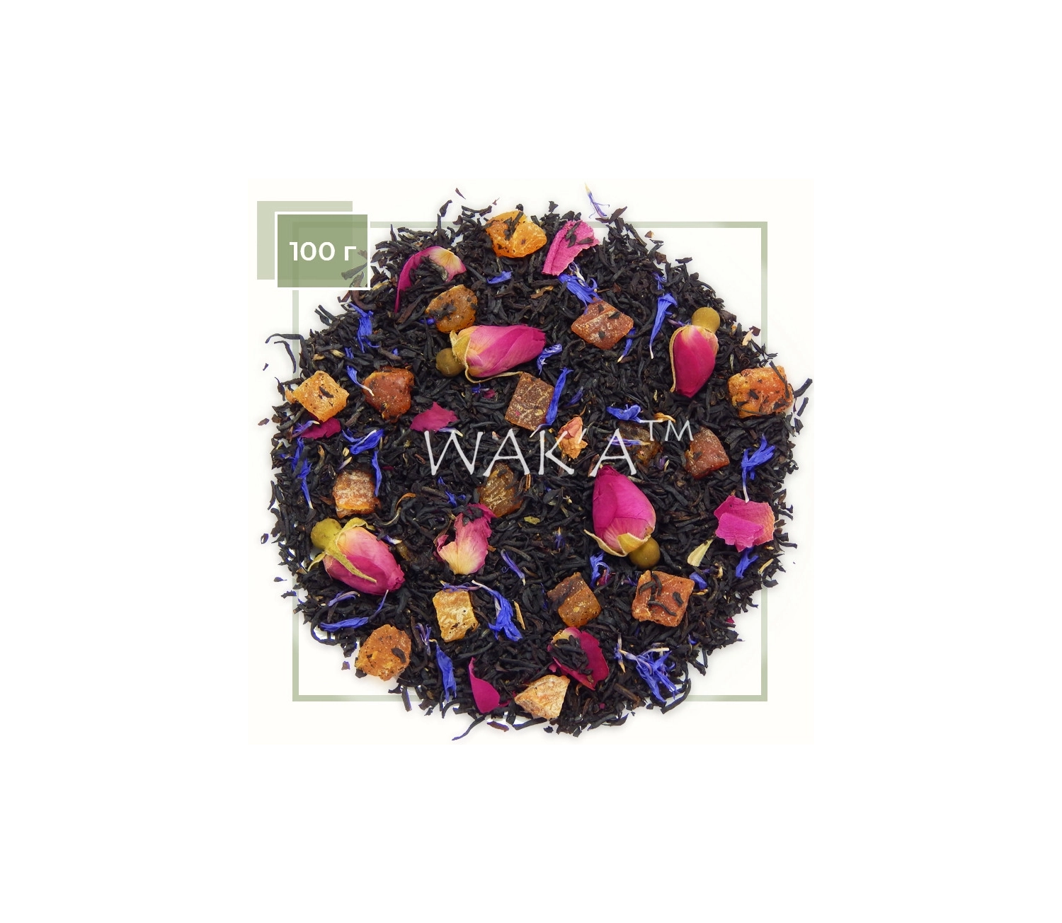 Чай черный Сочный персик 100 грамм Состав: цейлонский чай, лепестки чайной розы, бутоны чайной розы, лепестки василька, кусочки персика, натуральный ароматизатор