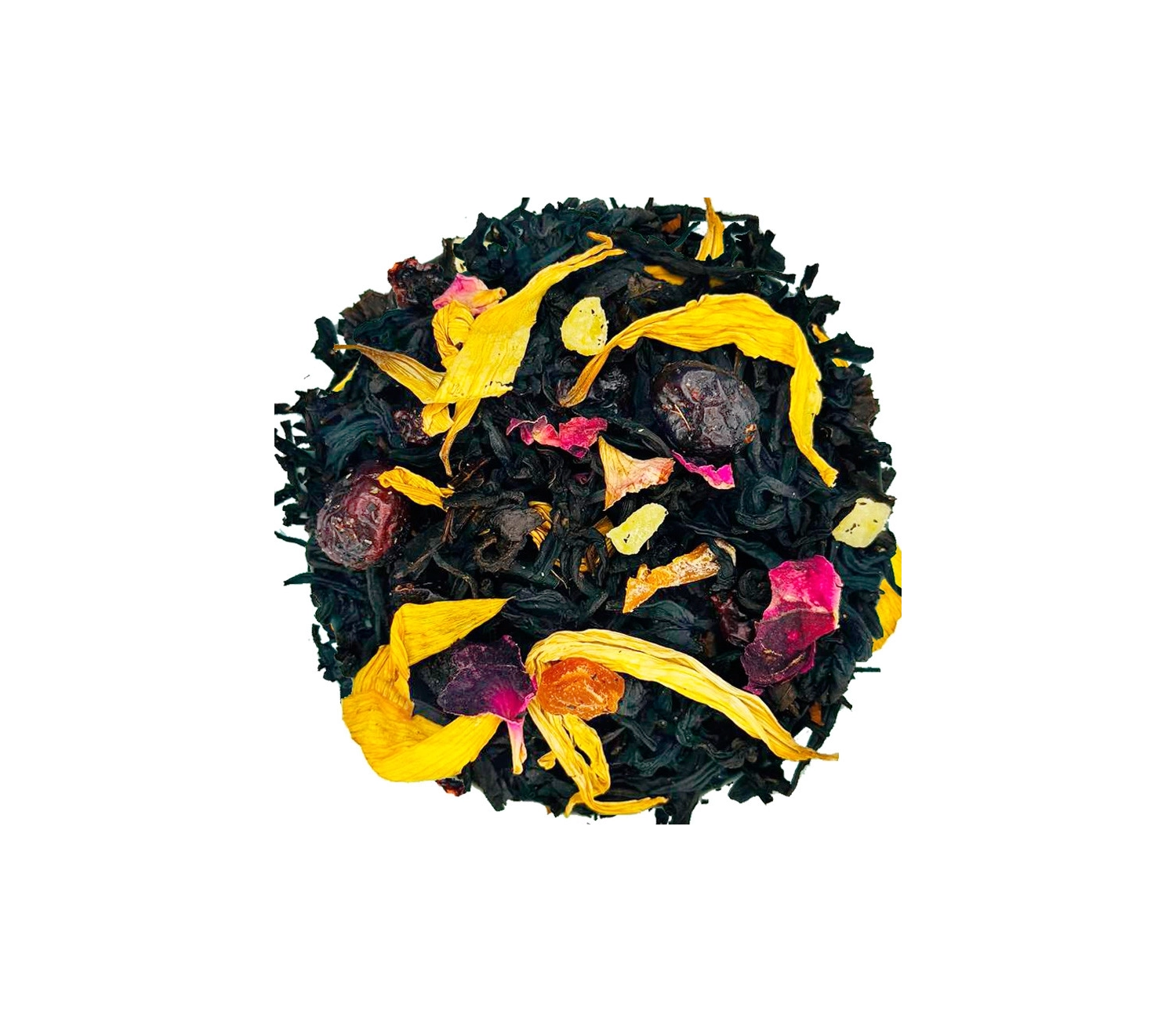 ЧАЙ ЧЕРНЫЙ ВОЛШЕБНЫЙ САД ТМ ВАКА 100г Состав: высококачественный индийский черный чай, ягоды красной смородины, ягоды клюквы, цукаты папайи и ананаса, лепестки и бутоны цветов, натуральный ароматизатор (экстракты фруктов, пищевые эфирные масла)