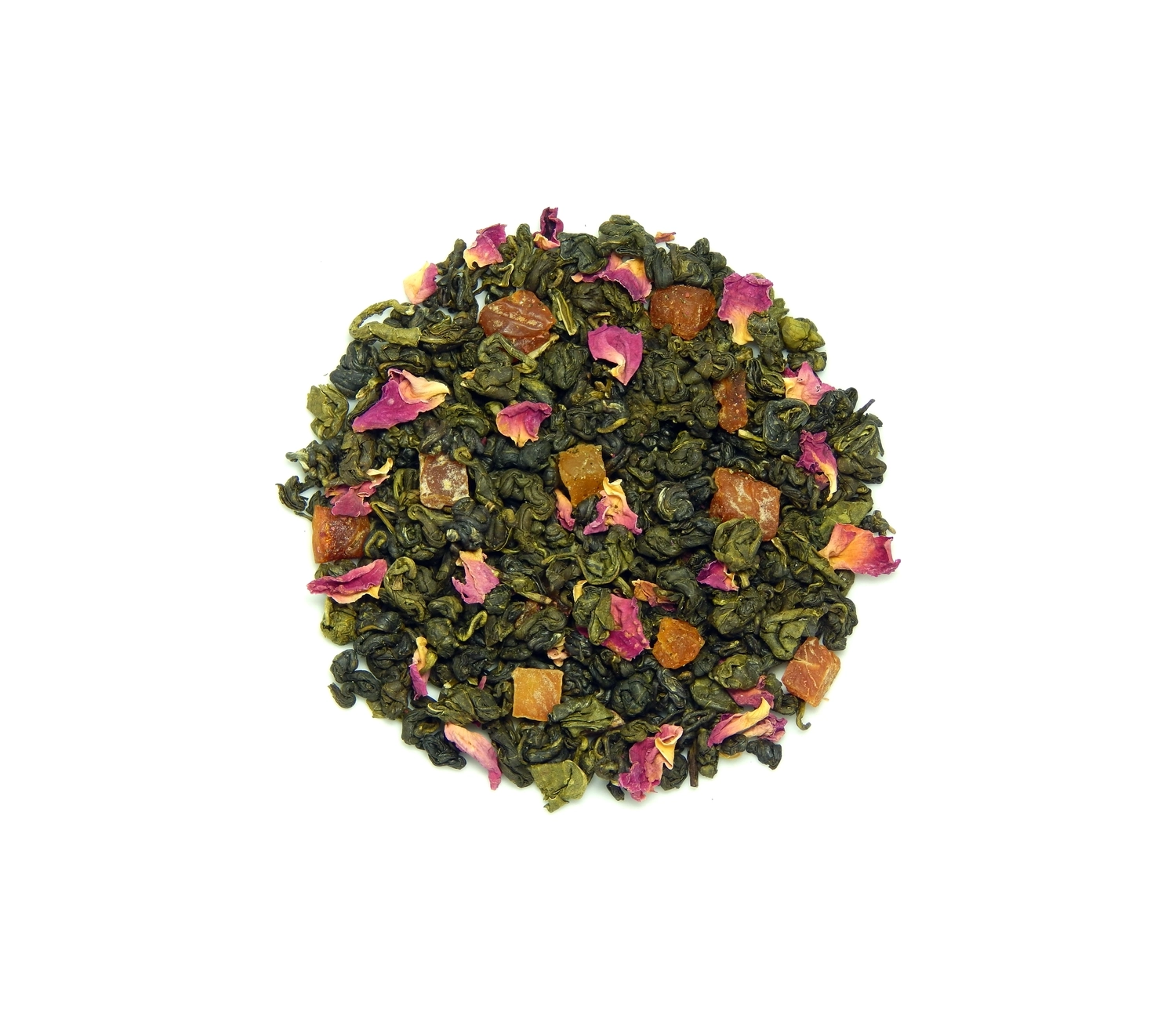 Чай зеленый Абрикосовый джем В состав входят: высококачественный китайский зеленый чай, кусочки абрикоса и лепестки роз