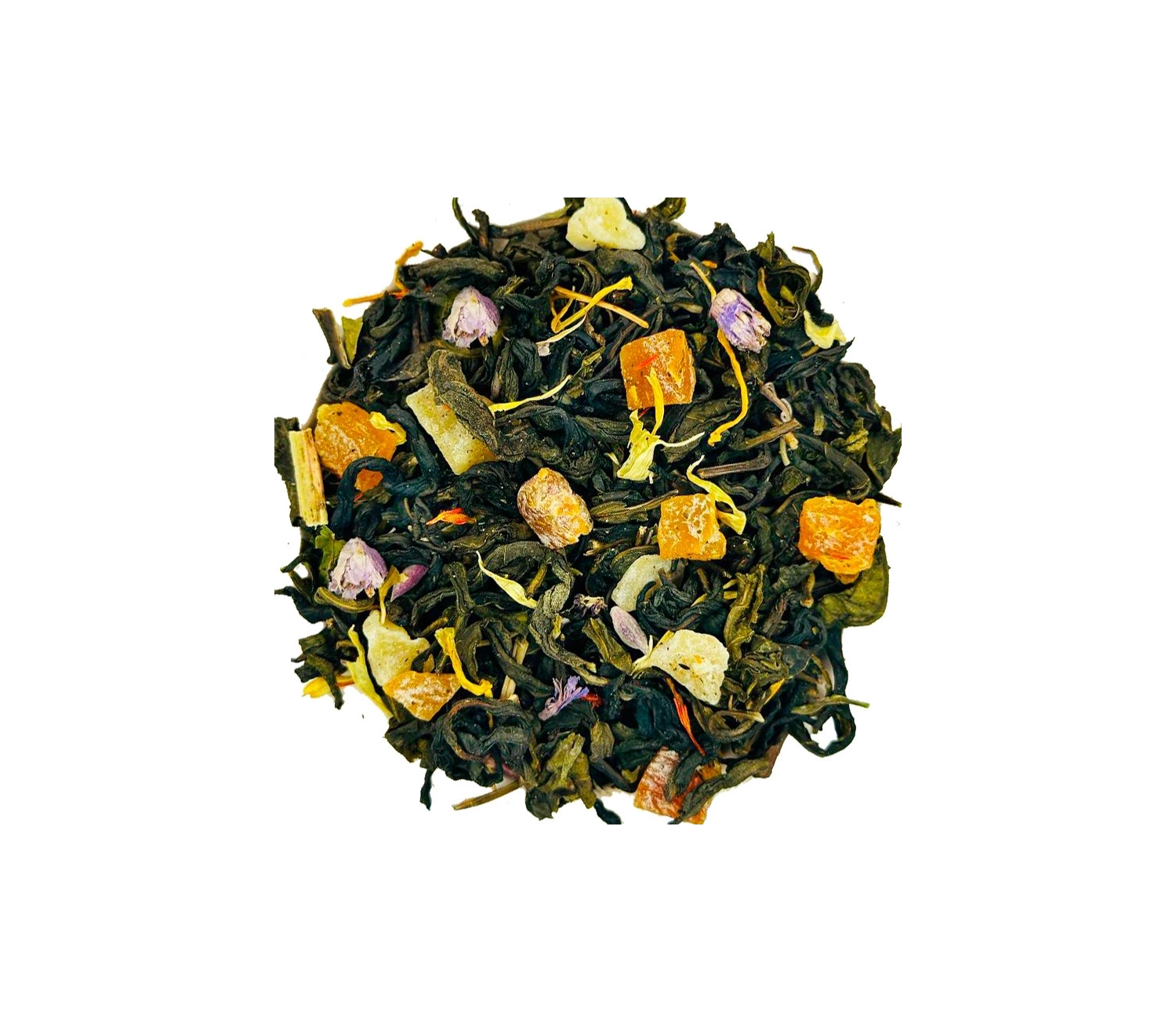 Чай зеленый Ананас Папайя 100г TM WAKA Состав: высококачественный индийский зеленый чай, цукаты ананаса, цукаты папайи, лепестки и бутоны цветов, натуральный ароматизатор (экстракты фруктов, пищевые эфирные масла).