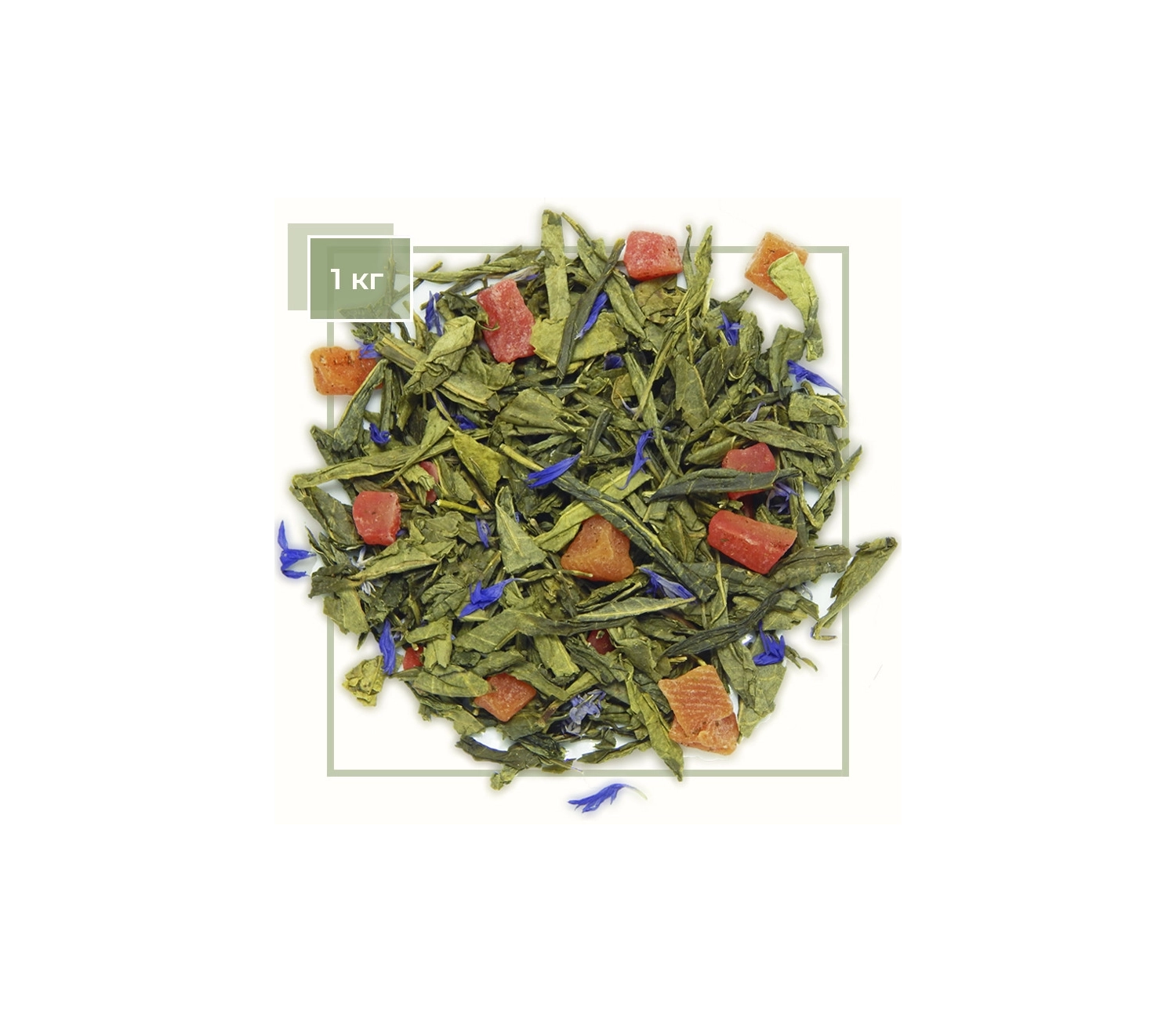 Чай зеленый ароматизированный Брызги шампанского 1 кг Состав: Высококачественный зеленый чай Сенча, кусочки земляники, кусочки карамели, лепестки василька, натуральный ароматизатор