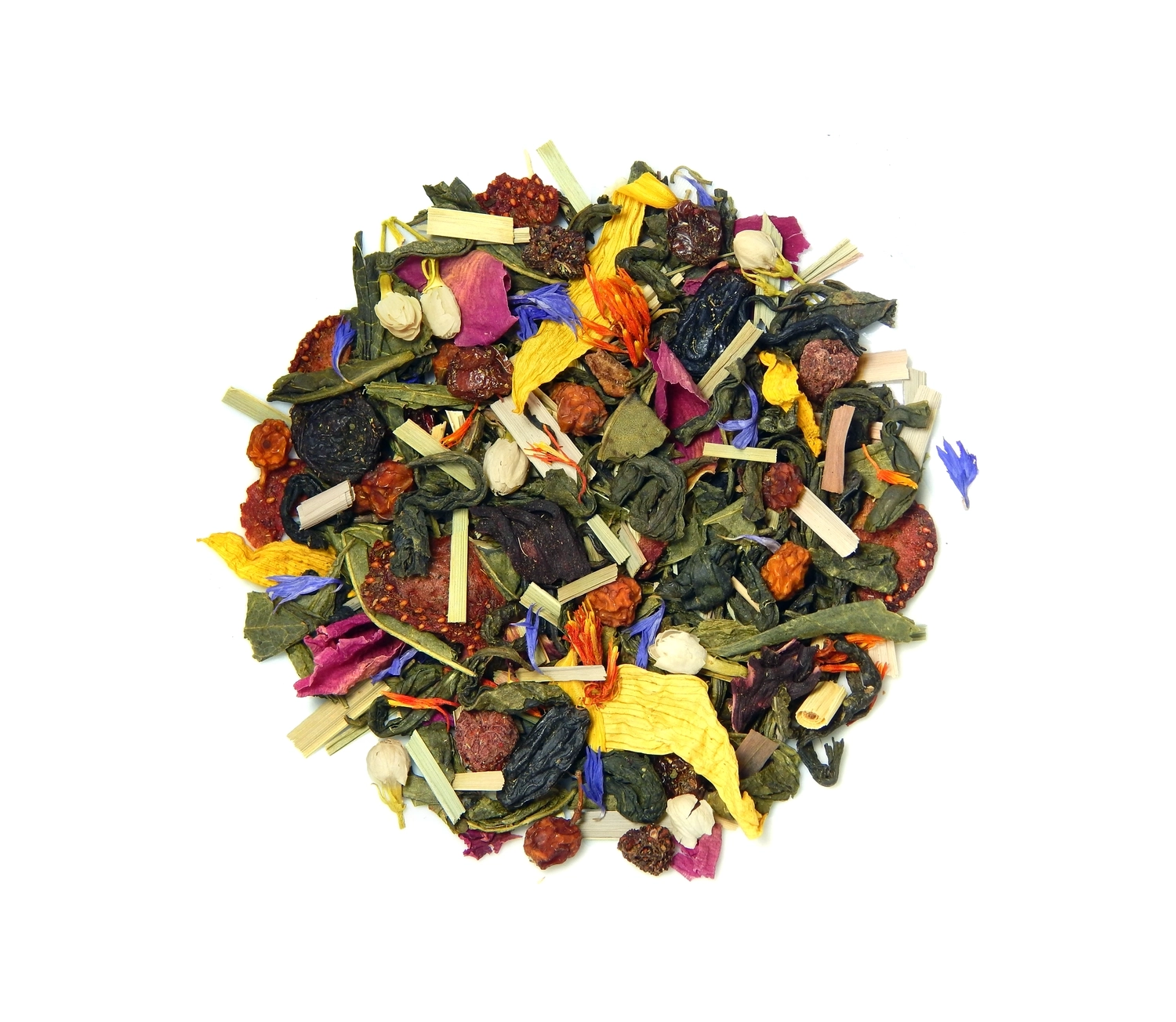 В состав входит высококачественный зеленый чай высшего сорта, ягоды сублимированной малины, кусочки сублимированной клубники, сушеные лесные ягоды, лепестки пиона, лепестки подсолнуха, натуральный ароматизатор