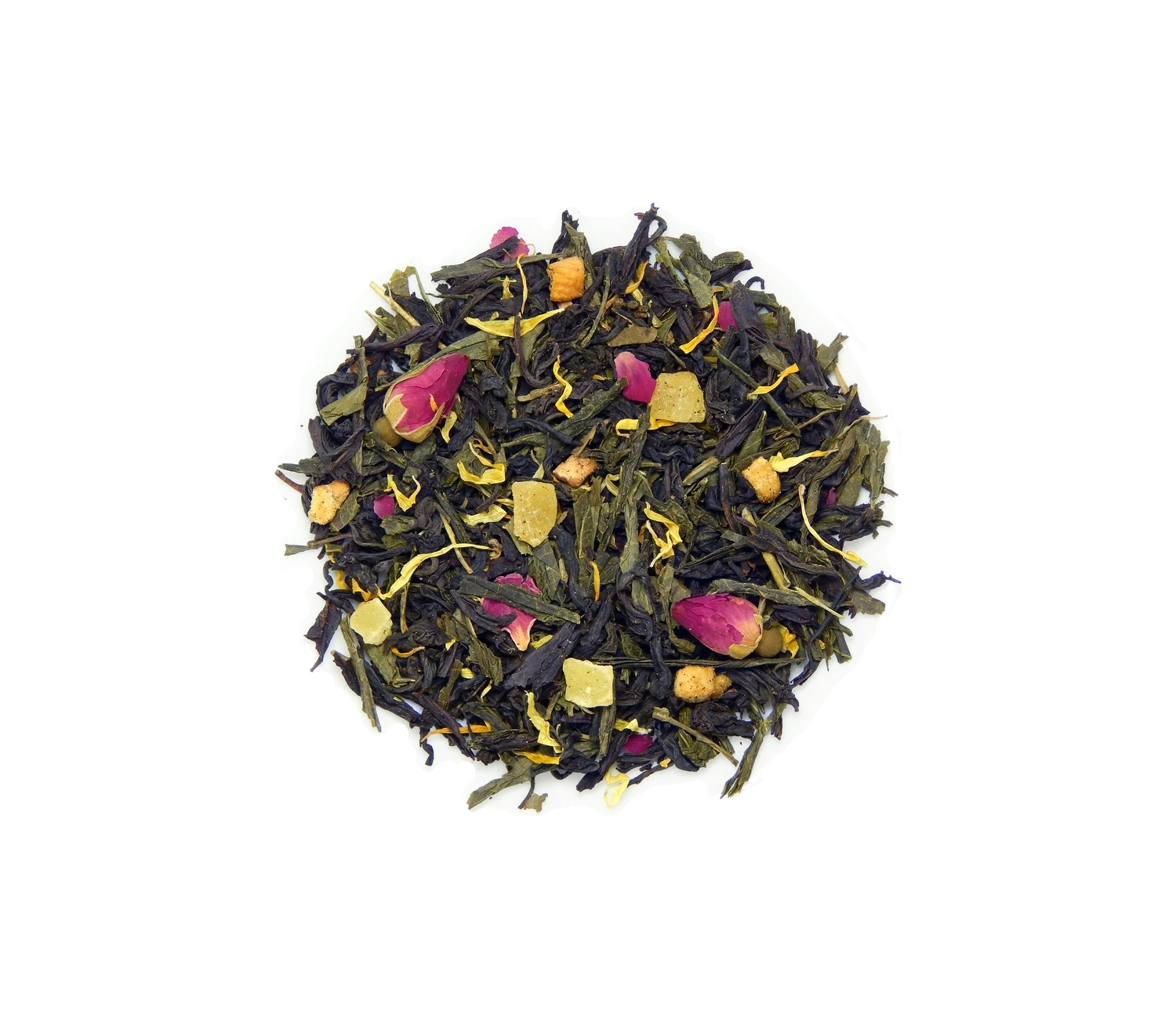 Смесь зеленого и черного цейлонкого чая с добавлением сафлора, лепестков розы, подсолнечника жасмина и календулы. Ароматизирован натуральными цветочными маслами.