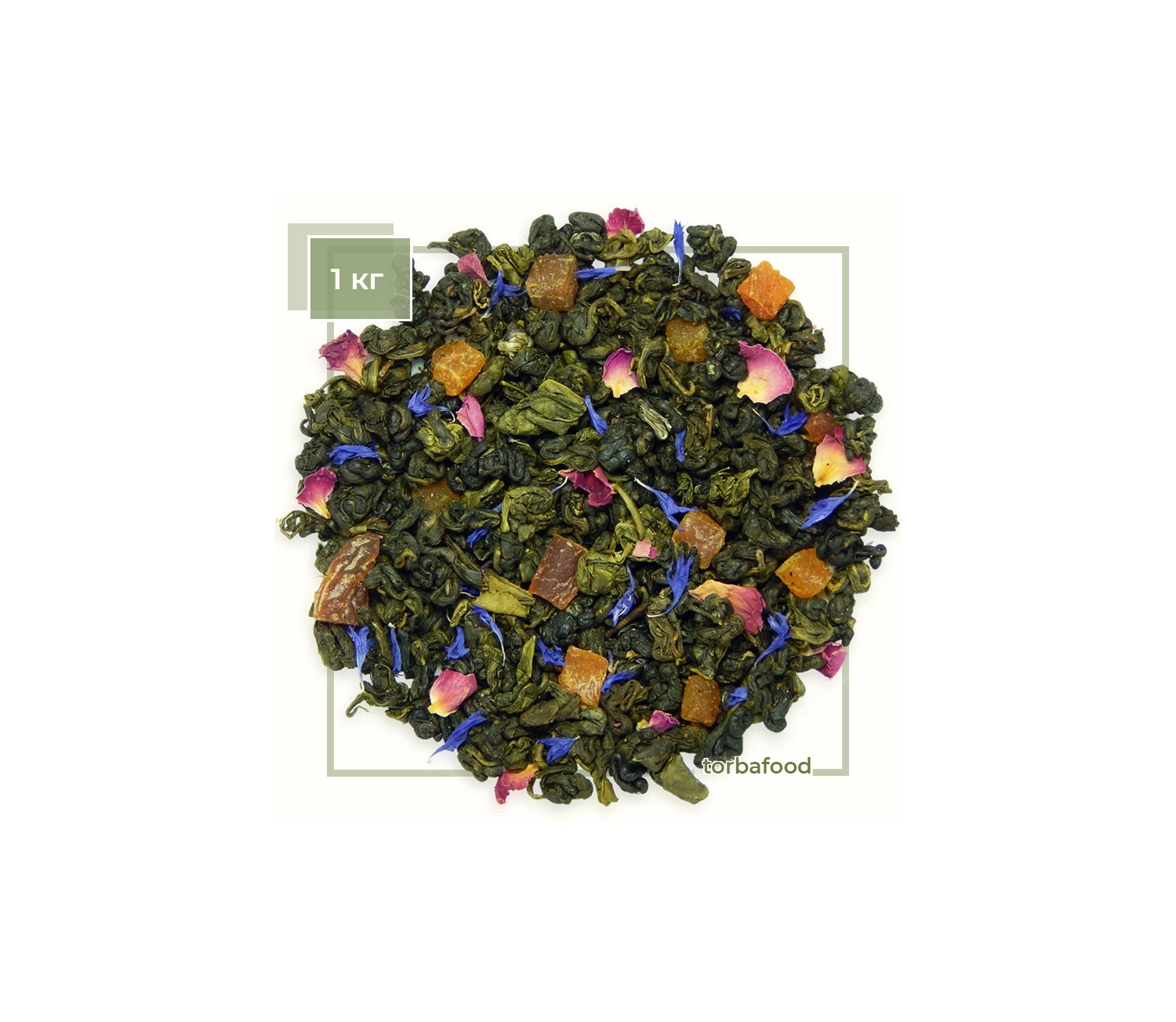 Чай зеленый Сочный персик 1 кг В состав входят: высококачественный китайский зеленый чай, кусочки персика, лепестки розы, лепестки василька, натуральный ароматизатор