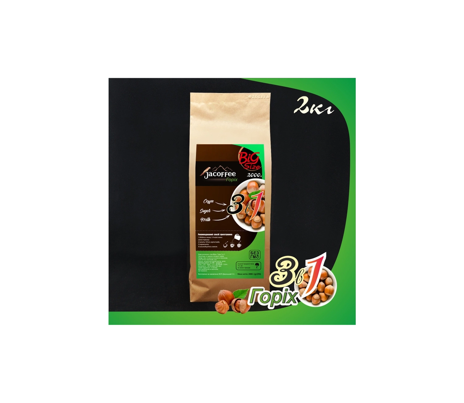 Кофе растворимый 3в1 Лесной орех ТМ Jacoffee, 2000 грамм Способ приготовления: насыпьте в чашку 3-4 чайных ложки кофе 3в1, залейте кипятком (150 мл) и хорошо перемешайте напиток. Приятного аппетита)