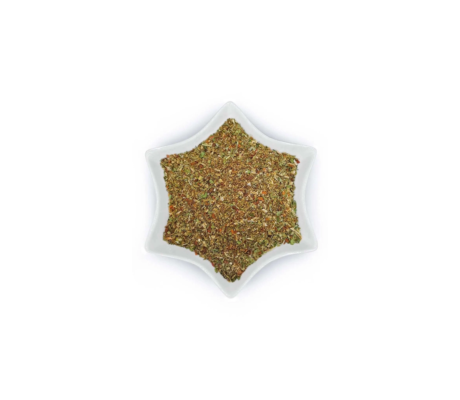 кориандр молотый, томат хлопья, паприка красная, петрушка, чабер, лук молотый, морковь (резаная 3*3 мм), базилик, перец черный молотый, мускатный молотый орех, майоран.