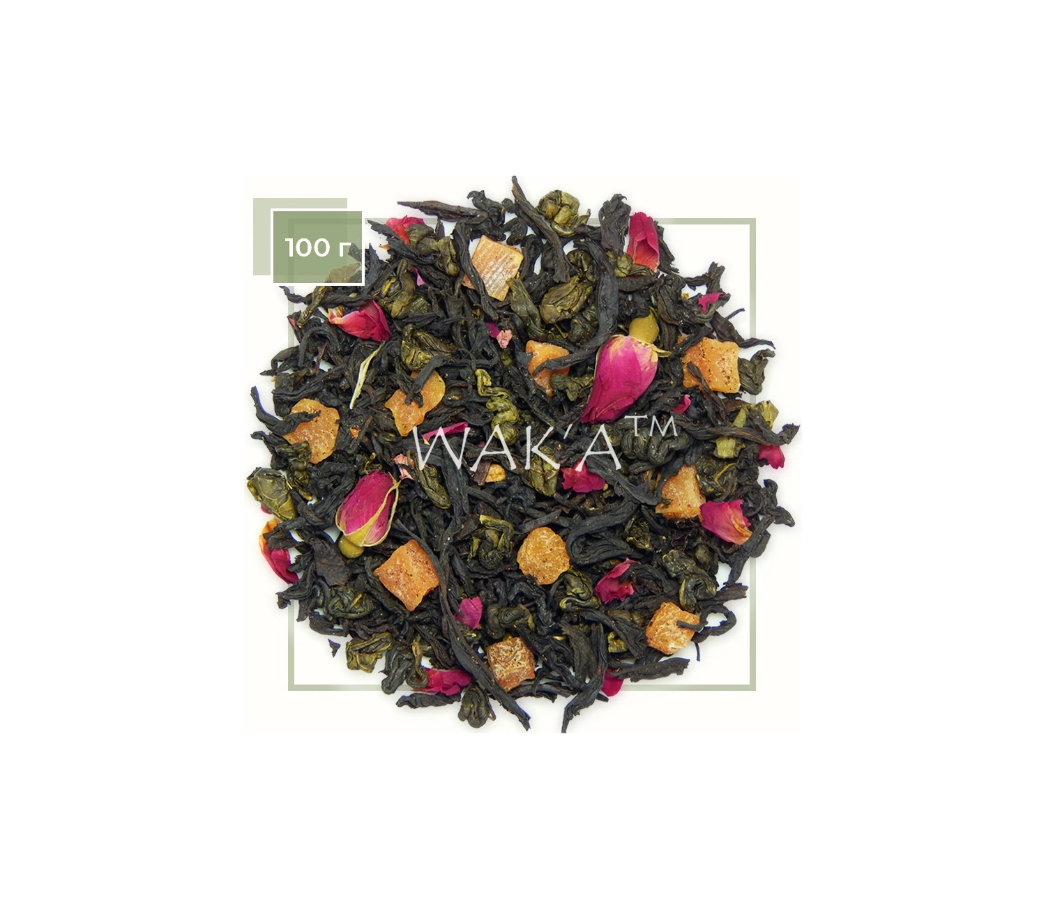 Чай чорний "1002 ніч" Абрикос Манго 100 грам - володіє вишуканим ароматом тропічних фруктів і терпким смаком. Склад: Суміш чорного та зеленого чаю, сублімований абрикос, бутони троянди, цукати ананаса, манго.