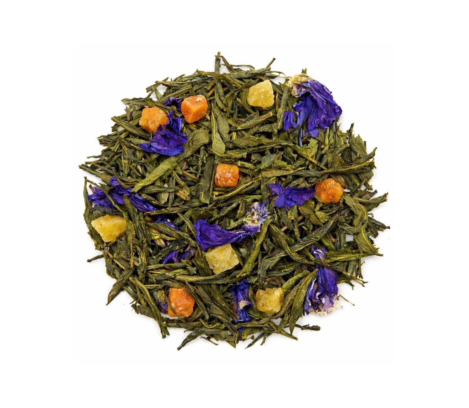Чай зелений ароматизований Маракуя персик Склад: Високоякісний зелений чай Сенча, шматочки маракуї, шматочки персика, квіти, натуральний ароматизатор