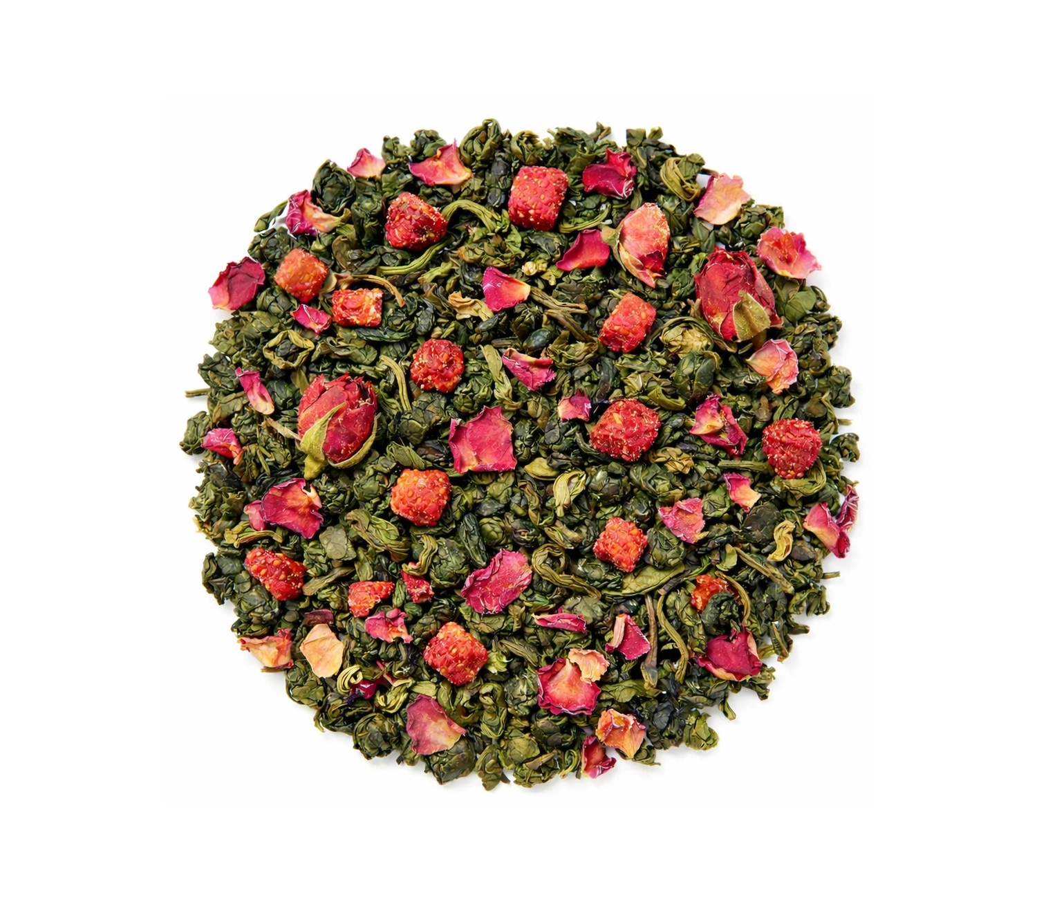 Чай зелений Сунична симфонія 100 грамів До складу входять: Зелений ароматизований чай зі шматочками суниці пелюстками суданської троянди та листям суниці.
