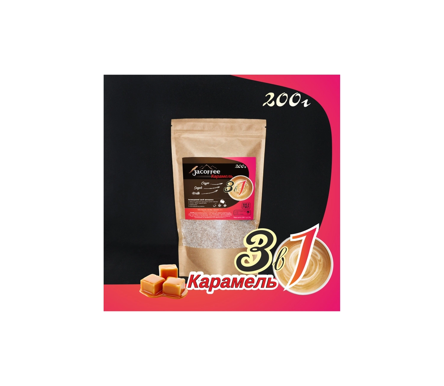 Кава 3в1 Jacoffee Карамель 200 грамів. Міцний, насичений, підбадьорливий смак із ноткою карамелі, у зручному пакованні. Спосіб приготування: насипте в чашку 3-4 чайних ложки кави 3в1, залийте окропом (140 мл) і добре перемішайте напій. Смачного)
