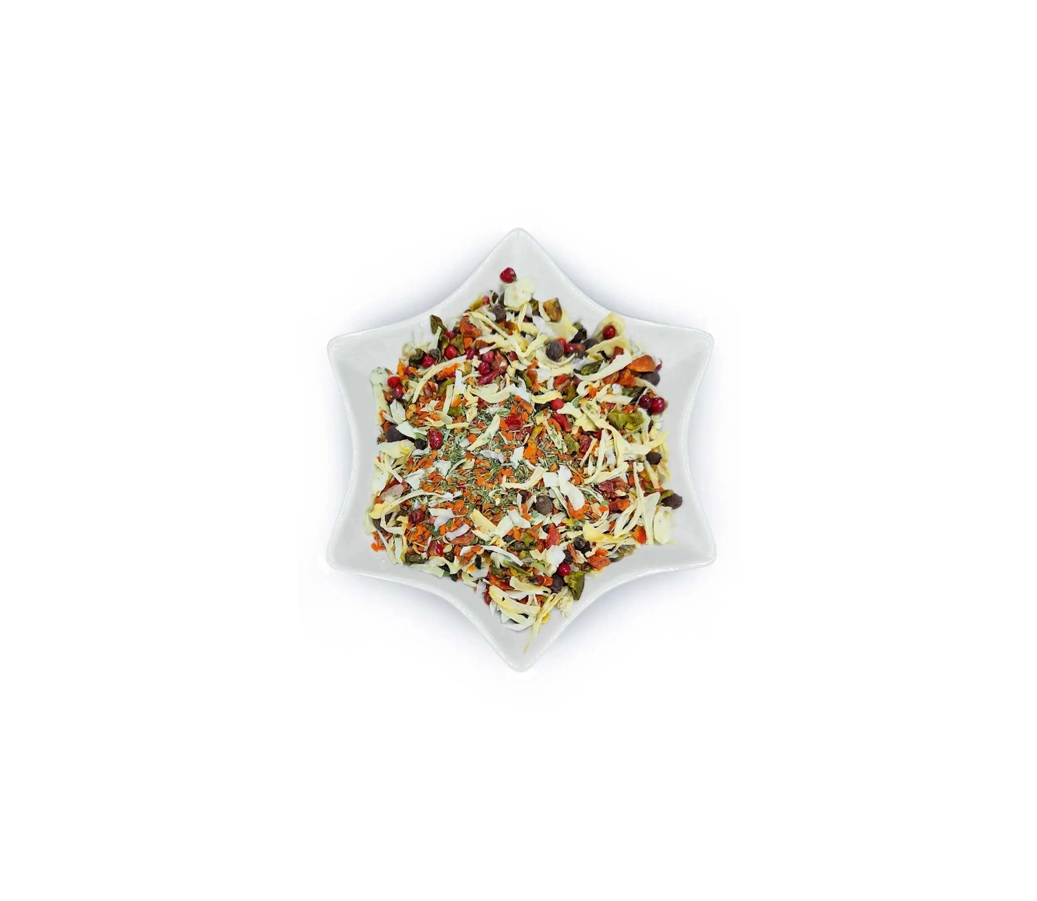 Склад приправи для бульйону: морква, цибуля, паприка зелена, кріп, паприка червона, перець духмяний, корінь петрушки, листя петрушки, перець рожевий, перець чорний. Використовується для: бульона, перших страв. Виробник: WAK'A Країна виробник: Україна Вага нетто: 500г