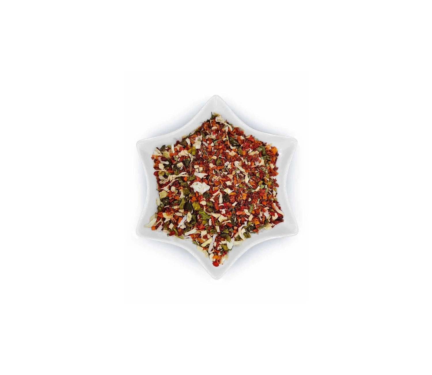 кориандр, паприка красная, лук, томат, петрушка, базилик, фенугрек, мускатный орех, перец белый, перец Чили красный молотый.